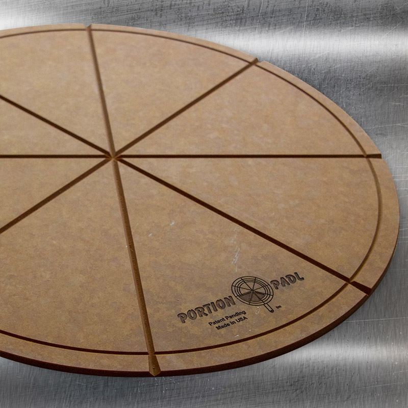 The patented and patent pending Portion PadL is one of the most popular pizza cutting boards and portioning guides used for cutting pizzas into equal slices. Ideal for pizza by the slice applications, the Portion PadL is custom made to your pizza size and slice applications. This equal slice pizza cutting board reduces food waste, increases profits and improves kitchen efficiencies. Simple to use and easy to clean, a new employee will be able to cut pizzas into equal slices their very first time.